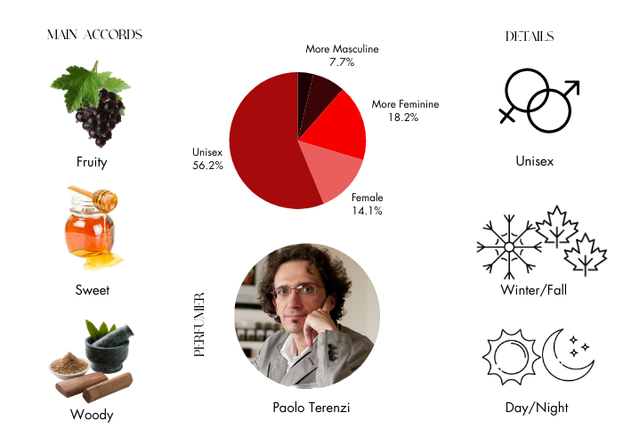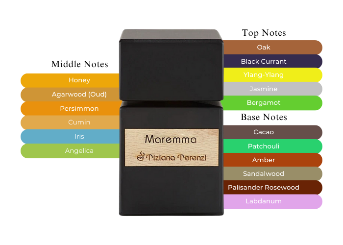 Maremma by Tiziana Terenzi's aromatic profile showcases a charming Tuscan fusion of wood, spice, and balsamic notes. The top notes unveil an alluring blend of floral and citrus elements, featuring ylang-ylang, jasmine, and black currant, complemented by bergamot and oak. This fragrance is well-loved, characterized by its fruity-sweet essence, and offers impressive projection and longevity.