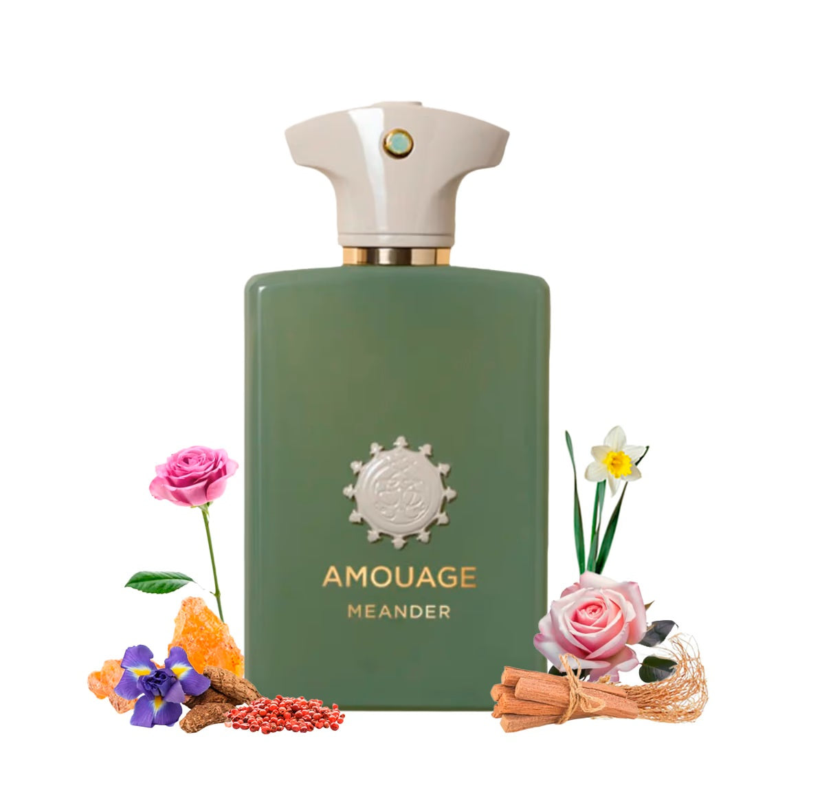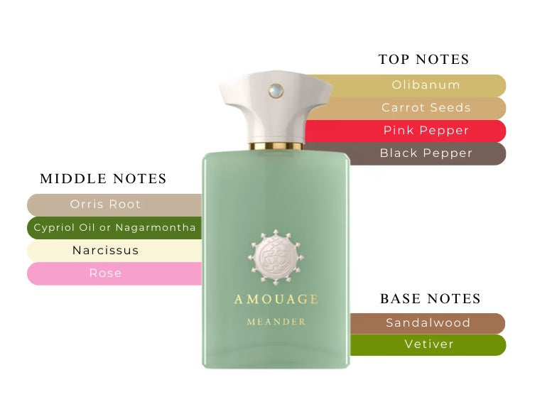 Meander begins with a spicy, earthy introduction featuring top notes of Olibanum, Carrot Seeds, Pink Pepper, and Black Pepper. The heart of the scent unfolds with a floral and woody richness, revealing Orris, Cypriol Oil (Nagarmotha), Narcissus, and Rose. The base notes of Sandalwood, Olibanum, and Vetiver leave a creamy, woody finish. This Amber Fougere fragrance embodies an oriental opulence.