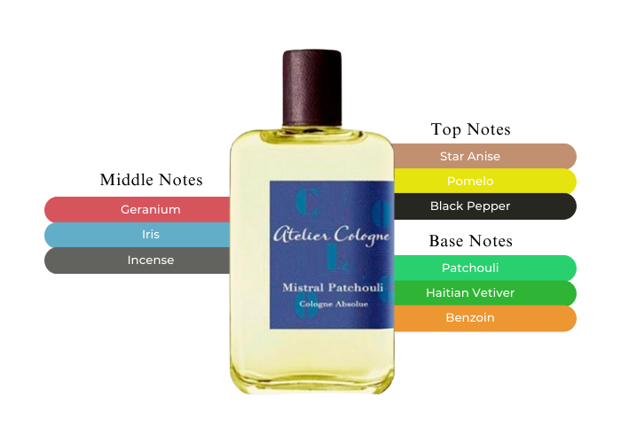 Atelier Cologne's Mistral Patchouli top notes feature refreshing pomelo, spicy black pepper, and sweet star anise, creating a lively introduction. The heart reveals a blend of floral iris, enigmatic incense, and aromatic geranium, which gracefully evolves into the base notes of earthy patchouli, warm benzoin, and the exotic aroma of Haitian vetiver.