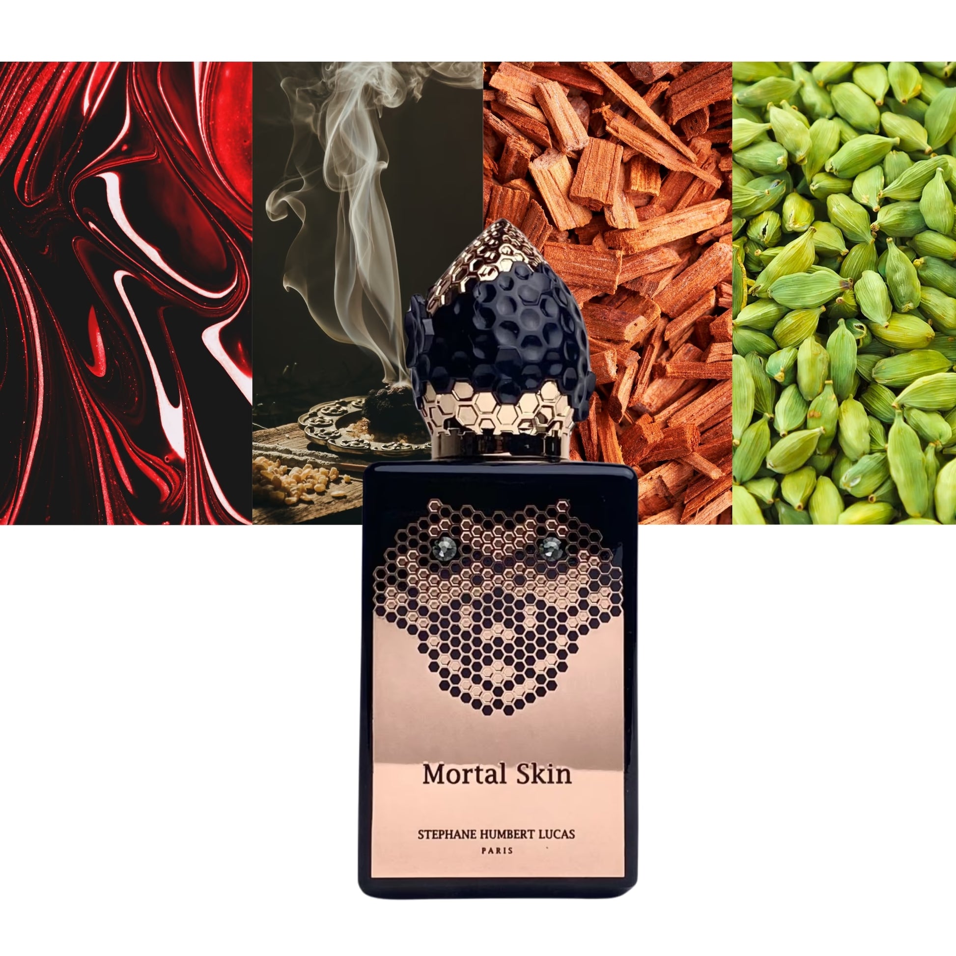 Mortal Skin opens with intriguing top notes of ink, blackberry, incense, and labdanum, enveloping you in an aura of mystique and depth. As the fragrance settles, heart notes of myrrh, opoponax, iris, cardamom, and artemisia reveal themselves, adding a complex, spicy, and slightly floral dimension to the scent.