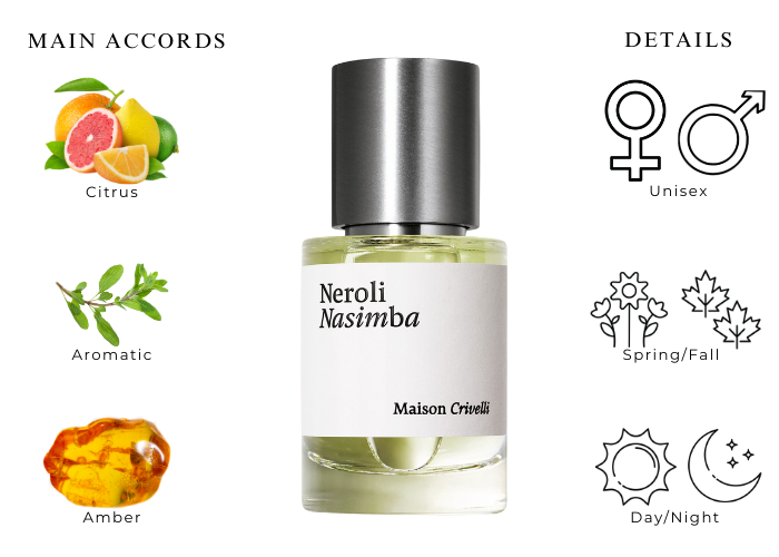 Maison Crivelli's Neroli Nasimba artfully combines the zesty brightness of neroli with the exotic intrigue of Nasimba, creating a captivating allure. The scent offers a sensory exploration, striking a refined balance between floral and spicy undertones. Neroli Nasimba stands as an olfactory work of art, meticulously designed by Maison Crivelli, encouraging wearers to immerse themselves in the charm of a truly unique and mesmerizing fragrance experience.