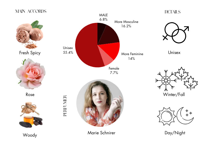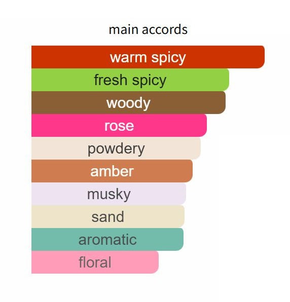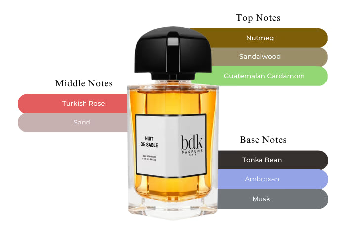 Nuit de Sable begins with top notes of creamy Sandalwood, spicy Nutmeg, and aromatic Guatemalan Cardamom. As the scent evolves, heart notes of lush Turkish Rose, delicate Rose, and earthy Sand emerge, enveloping the wearer in a rich, floral embrace that is both captivating and sophisticated.
