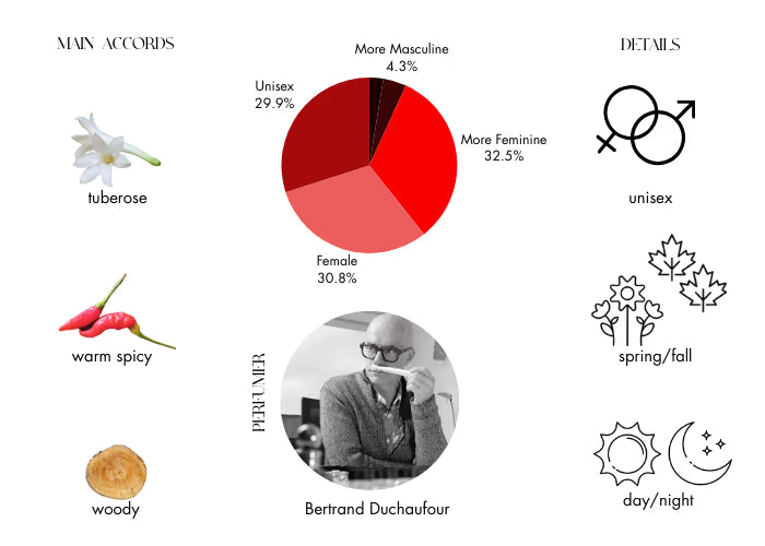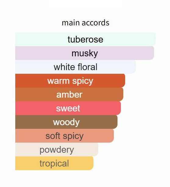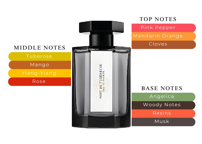 Nuit de Tubereuse opens with lively top notes of pink pepper, cloves, and mandarin orange, leading into a heart that showcases a captivating combination of tuberose, mango, ylang-ylang, and rose. The scent then settles into warm base notes of angelica, precious woods, resins, and musk. Nuit de Tubereuse presents a fresh and luxurious interpretation of tuberose, emphasizing both its vibrant and sumptuous aspects.