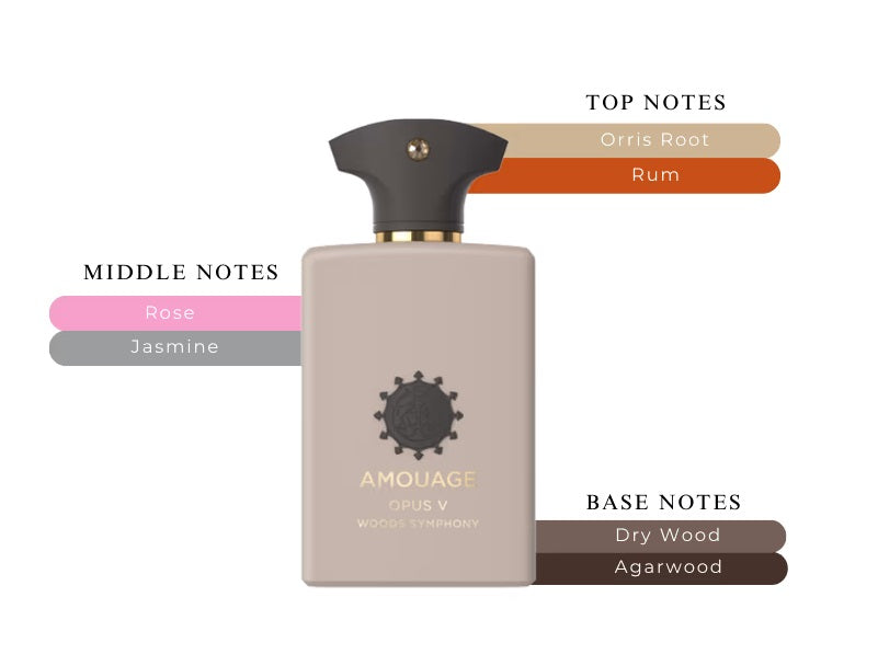 Opus V Woods Symphony features a seamless fusion of woody, floral, and musky notes. The top notes present a captivating mix of Orris Root and Rum, leading into a heart composed of Orris Root, Rose, and Jasmine. The base notes consist of Agarwood (Oud), Dry Wood, and Civet, resulting in a rich and mesmerizing scent experience. Opus V Woods Symphony serves as a tribute to the future, conjuring a vision of a world where knowledge is both transformative and elusive.