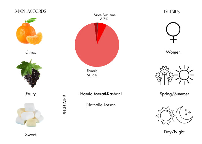 Oriana tells the tale of a captivating heroine, leaving behind a mesmerizing trail. It is crafted with a texture that unfolds like a mille-feuille, blending layers of sweetness, softness, and sensuality. The top notes feature a refreshing trio of mandarin, bergamot, and grapefruit, which transition into a delightful heart of orange blossom, blackcurrant, and raspberry. The base combines marshmallow and musk, adding a distinct and irresistible charm to this euphoric scent.