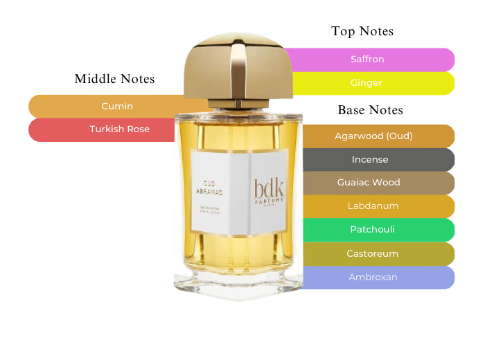 Oud Abramad opens with captivating top notes of saffron and ginger, creating an intoxicating first impression. As the fragrance evolves, the heart notes of cumin and Turkish rose add a touch of warmth and floral elegance. The base notes of agarwood (oud), guaiac wood, incense, labdanum, patchouli, castoreum, and ambroxan create a rich and lasting impression, enveloping you in a sophisticated aura.