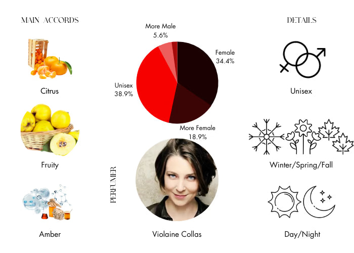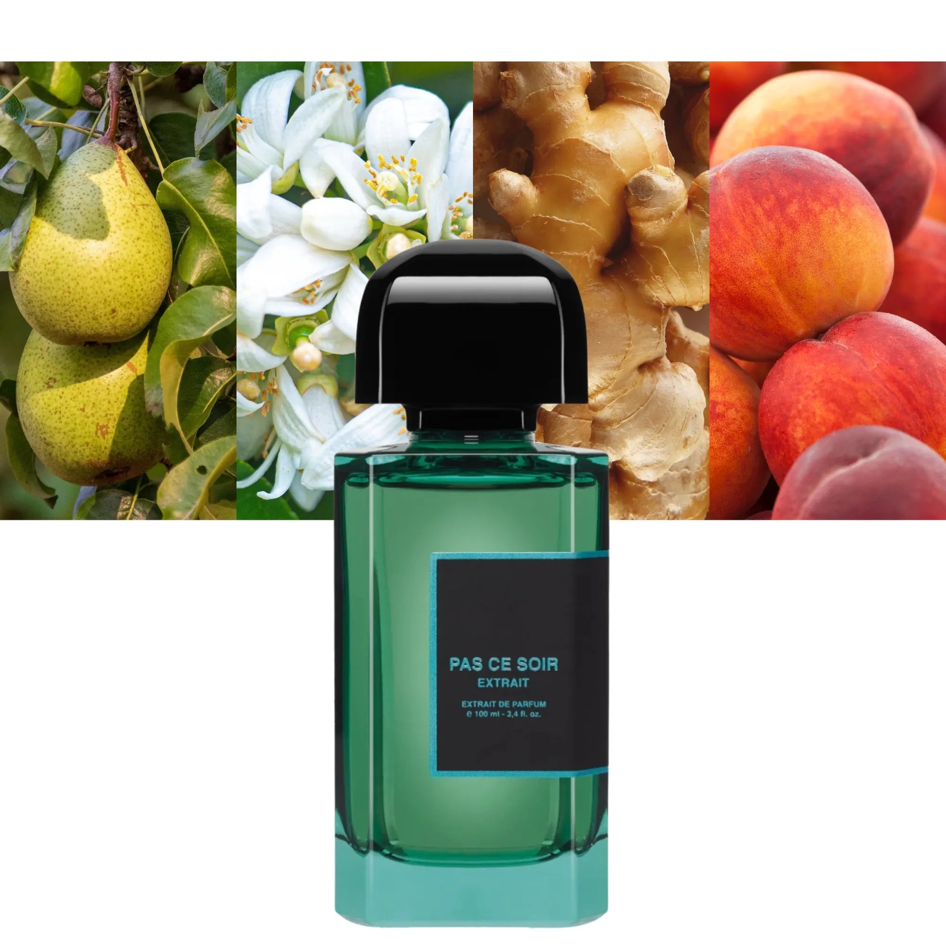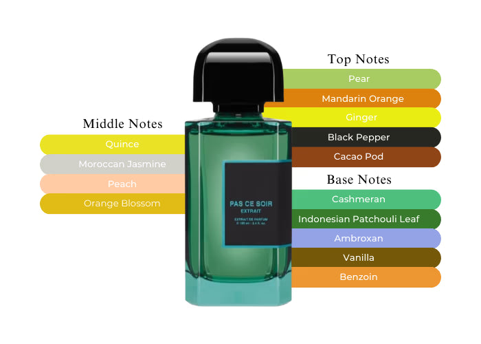 Pas Ce Soir Extrait begins with an alluring combination of pear, ginger, mandarin orange, cacao pod, and black pepper. The heart unfolds with a delightful blend of quince, peach, Moroccan jasmine, and orange blossom. As it settles, the fragrance reveals a base of cashmeran and Indonesian patchouli leaf. It beautifully intertwines the gourmand notes of cocoa with the zesty freshness of black pepper and ginger, while the lush peach notes enhance the fruity sweetness of quince chutney and orange blossom.