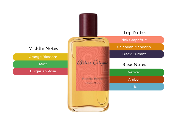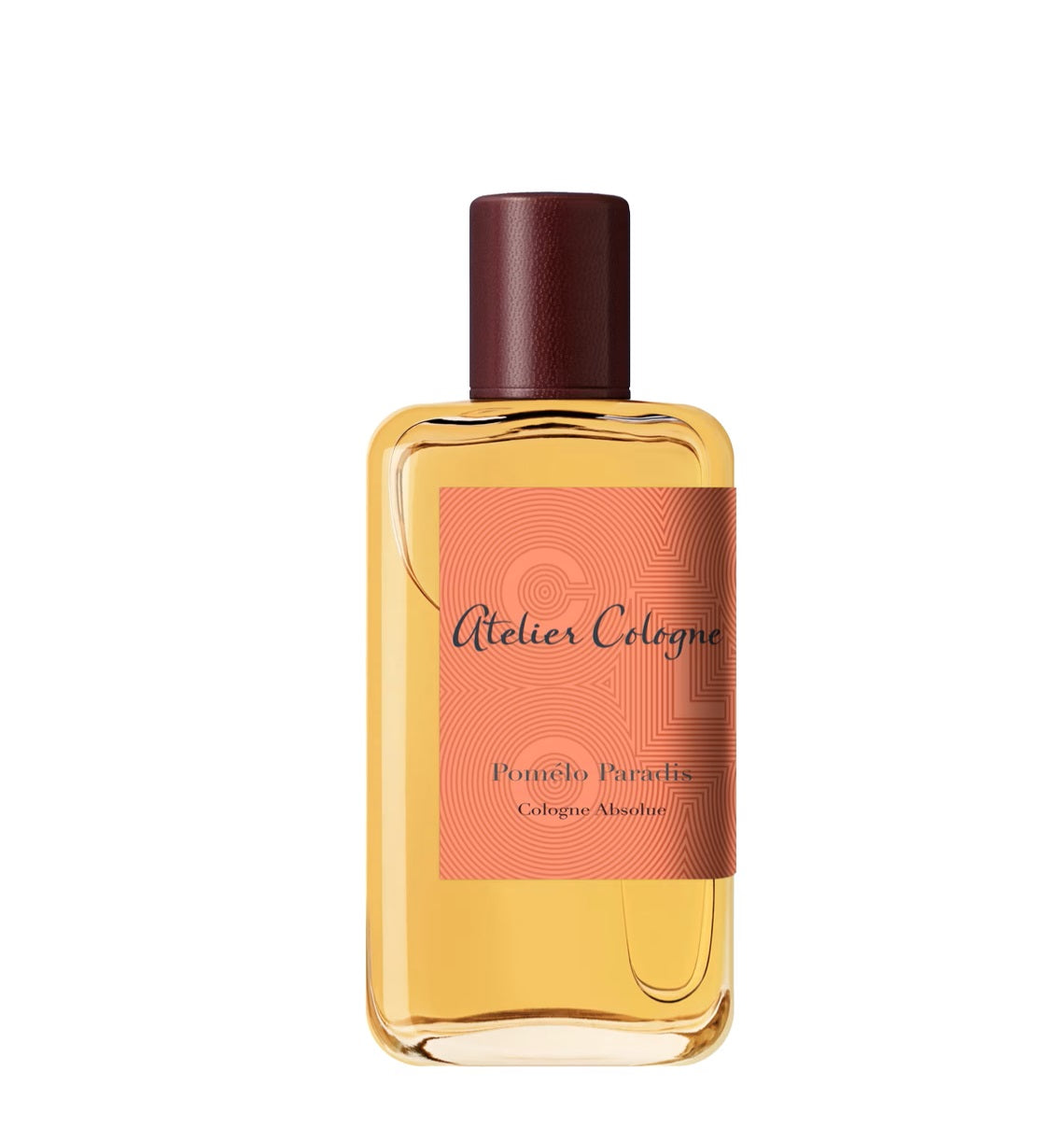 Atelier Cologne's Pomelo Paradis, Its top notes of pink grapefruit and Calabrian mandarin blend seamlessly with black currant, creating a vivid imagery of a coral sunset filled with intricate nuances. The heart of the fragrance flourishes with orange blossom, mint, and Bulgarian rose, evoking a sense of wonder. The base notes of vetiver, amber, and iris offer a grounding yet uplifting finish.