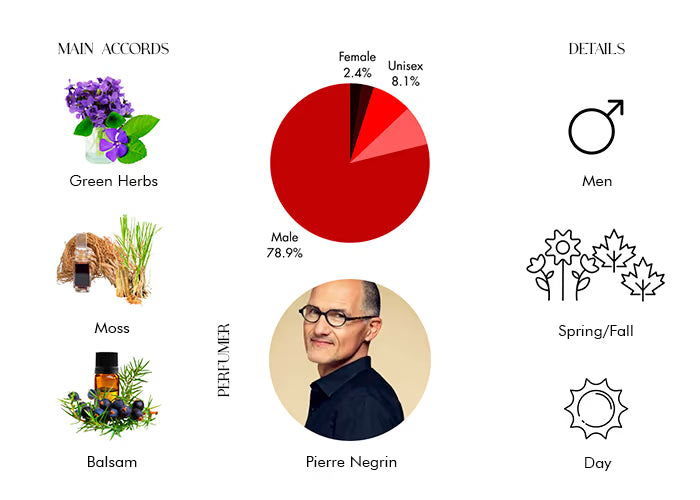 Portrayal Man begins with a captivating note of Violet Leaf, which is green, watery, and shadowy, reminiscent of a lone plant thriving beneath a pristine layer of snow. This transforms into visions of czars enveloped in luxurious furs, immersed in the breathtaking beauty of a vibrant taiga. The scent is further enriched by a subtly sweet, powdery aroma of imagined Violet flowers, resulting in a woody-floral composition with green undertones. The ingredients, including Limonene, Benzyl Salicylate, Coumarin, and others, may vary but play a key role in crafting its distinctive olfactory character.
