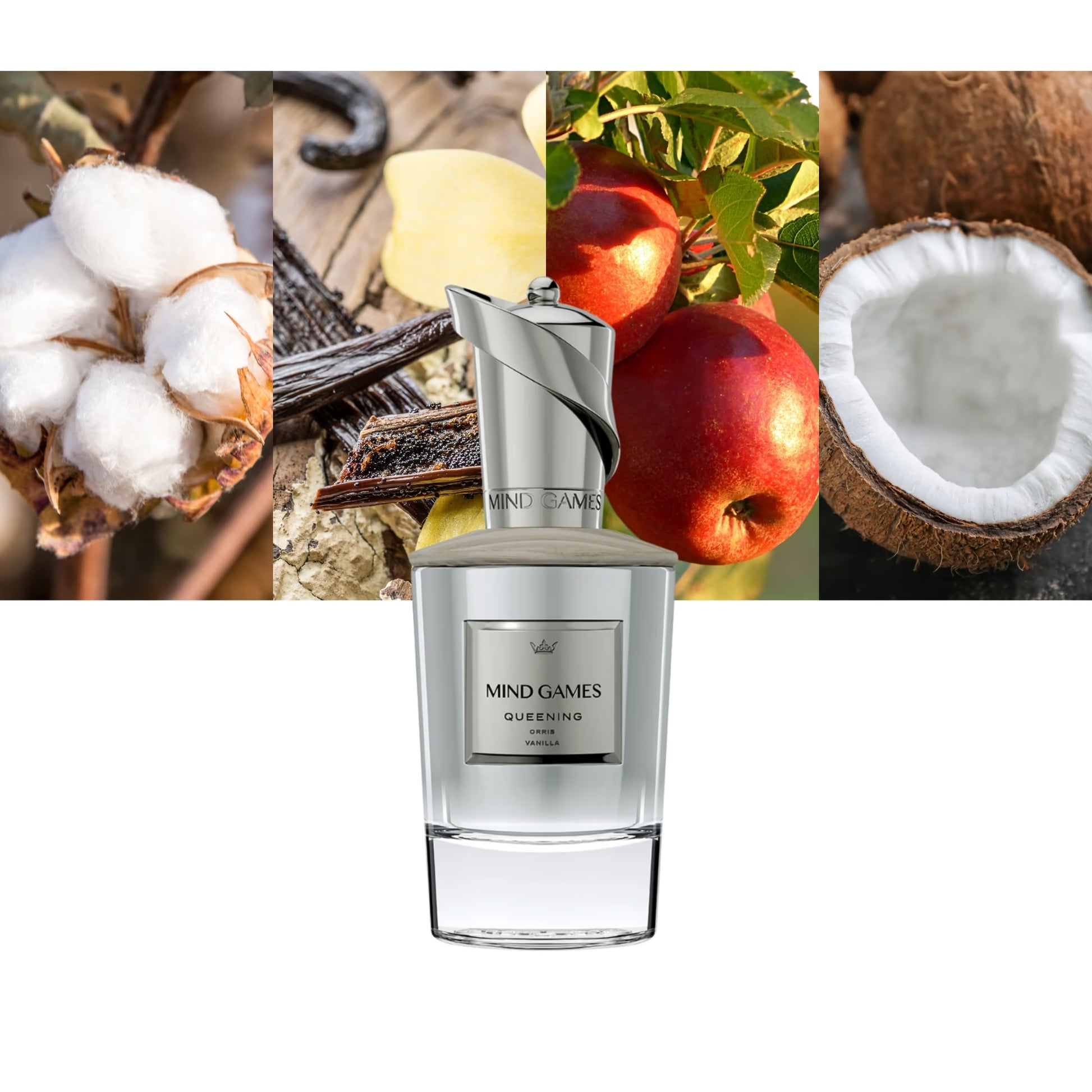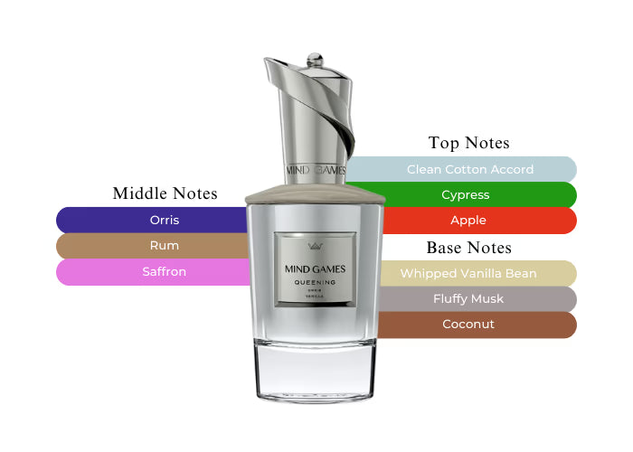 Queening opens with a fresh and airy burst of cotton flower, crisp apple, and refreshing cypress. These top notes awaken the senses and set the stage for a heart full of warmth and richness. Middle notes of smooth rum, exotic saffron, and earthy orris root create an intriguing depth that draws people in. As the fragrance settles, it reveals a soft, creamy base of comforting vanilla, tropical coconut, and sensual musk, leaving behind a trail that’s both inviting and unforgettable.