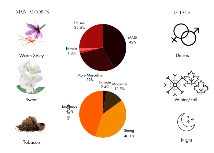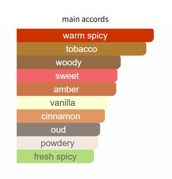 Red Tobacco opens with an intriguing combination of saffron, cinnamon, incense, nutmeg, white peach, green apple, and Nepalese oud. These top notes create an inviting and warm introduction that entices the senses. As the fragrance develops, the heart notes of patchouli and jasmine emerge, adding depth and complexity to the blend. Finally, the base notes of tobacco, amber, woody notes, vetiver, vanilla, and white musk provide a lasting and memorable finish that lingers on the skin.