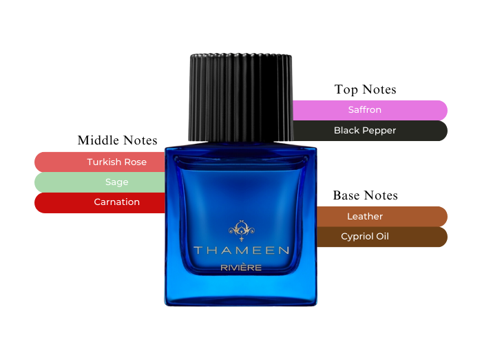 Riviere by Thameen begins with the warm spiciness of Indian black pepper and Persian saffron, transitioning into a heart composed of Turkish rose, sage, and carnation. The base notes showcase a rich combination of cypriol oil (Nagarmotha) and leather, infusing the fragrance with depth and a hint of sensuality. The scent is further elevated by the addition of Ceylon, lemon blossom, Indonesian patchouli, oud, and rich amber.
