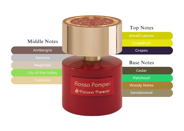 Tiziana Terenzi's Rosso Pompei begins with a vibrant mix of Grapefruit, Amalfi Lemon, and Grapes, transitioning into a heart enriched with Ambergris, Magnolia, Jasmine, Tuberose, and Lily-of-the-Valley. The fragrance's base features a cozy blend of Cedar, Patchouli, Woody Notes, and Sandalwood. Inspired by the city of Pompeii, a timeless symbol of the Roman Empire, this fragrance captures its beauty and enduring allure.