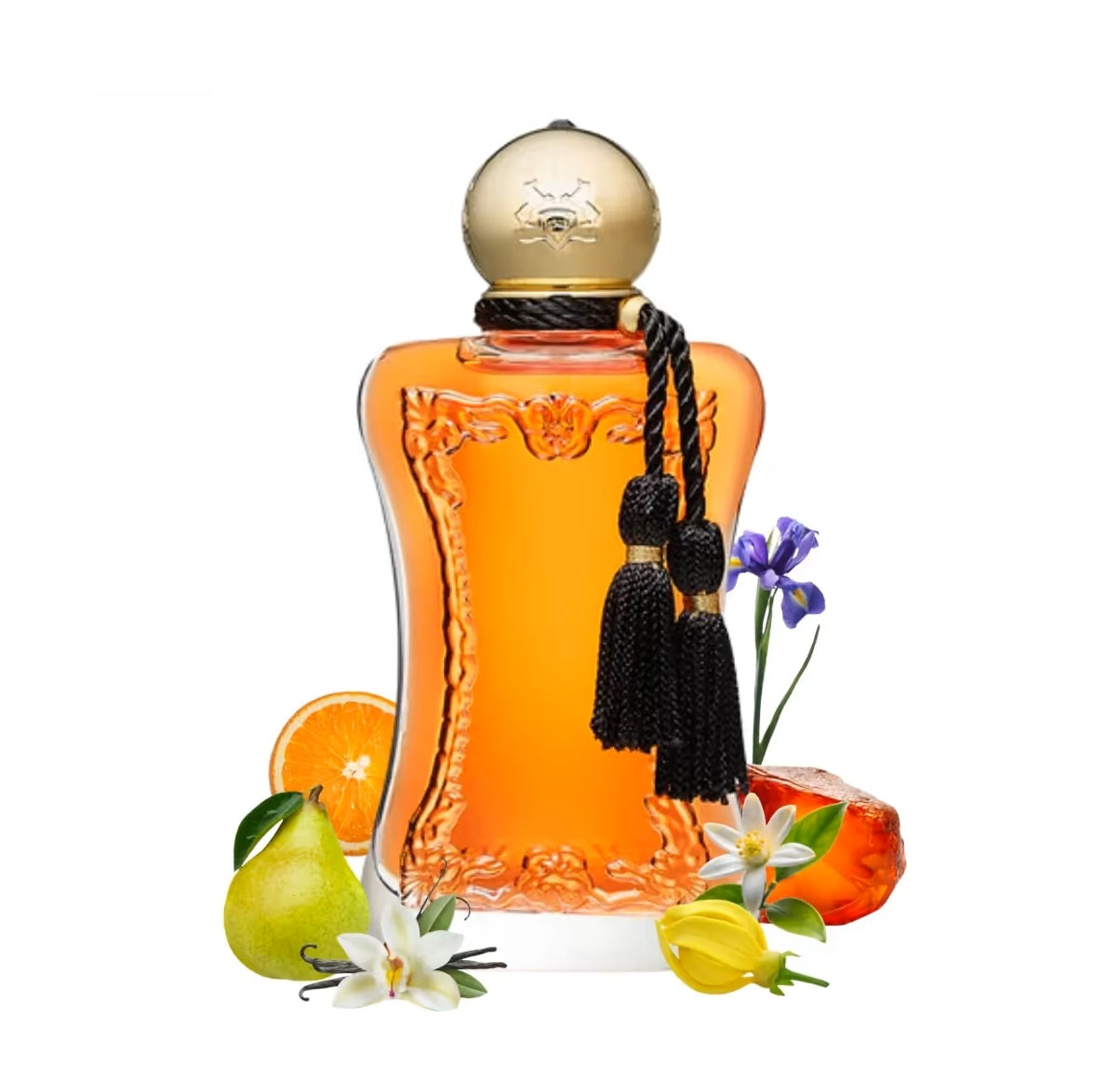 Safanad begins with a refreshing, fruity blend of pear and orange, delicately enhanced with petitgrain essence. The heart of Safanad unfolds with a floral trio of ylang-ylang, orange blossom, and jasmine sambac absolute, exuding a light, luminous quality. As the scent evolves, it settles into a warm, velvety base of amber, reminiscent of sunlight, leaving behind a coveted aroma that epitomizes beauty and grace.