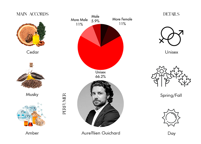 Parisian Musc opens with the distinctive aroma of Virginia cedar, creating a captivating first impression. As the fragrance unfolds, the heart notes of ambrette, also known as musk mallow, impart a unique, musky charm. Finally, the base notes of musk, ambrettolide, and ambroxan provide a lasting, sophisticated finish.