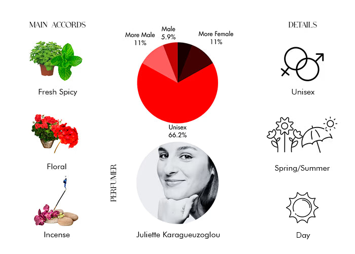 The fragrance gracefully settles into a base of benzoin, vanilla, white musk, and incense, leaving a lingering, delightful trail that is both comforting and alluring.