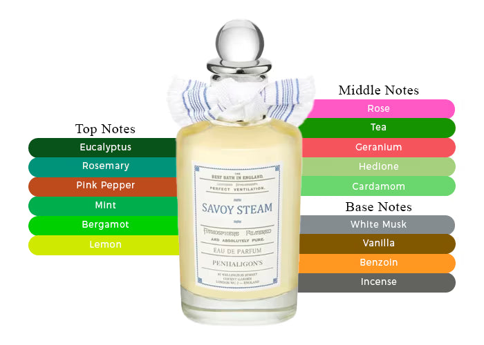 Savoy Steam  opens with invigorating top notes of eucalyptus, pink pepper, rosemary, bergamot, mint, and lemon. These fresh and zesty elements awaken your senses, setting the stage for a heart of rose, cardamom, tea, geranium, and hedione. These middle notes add a touch of sophistication and warmth, wrapping you in a soft, elegant embrace.