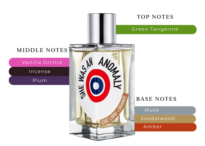 She Was An Anomaly opens with a vibrant top note of Green Tangerine, transitioning into a heart that features Vanilla Orchid, Incense, and Plum. The fragrance culminates with base notes of Musk, Sandalwood, and Amber. Reflecting the unconventional essence of Etat Libre d'Orange, this perfume breaks away from tradition, presenting a fascinating interplay of contrasts: light and dark, indulgent yet pleasant, romantic and cynical, sincere and ironic. Created with Givaudan's advanced perfumer's tool, Carto, it showcases a dedication to creativity and boldness.