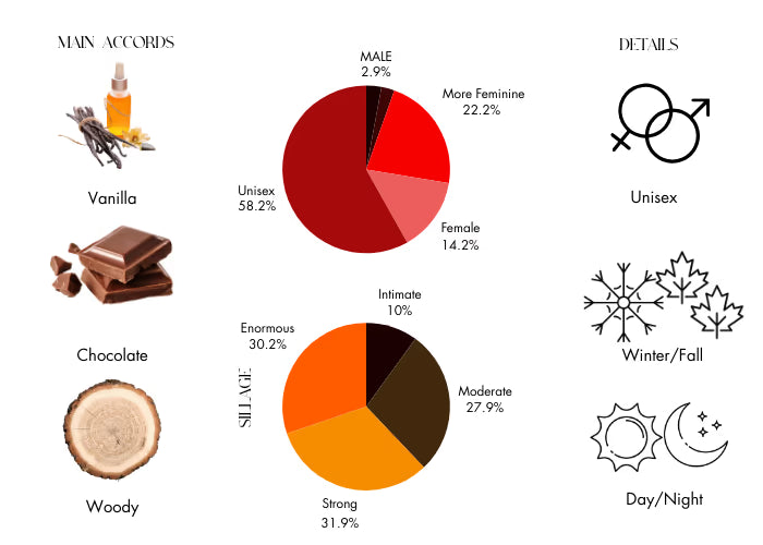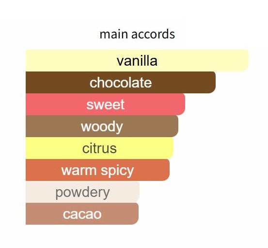 Sorriso blends the sweet charm of vanilla and chocolate with comforting woody and citrus notes. The fragrance is enriched with warm spicy, cacao, and powdery undertones, crafting a sophisticated scent that appeals to both men and women. Its impressive longevity and good sillage ensure that the scent remains prominent. The delightful combination of chocolate and orange adds an enticing layer to this elegant gourmand fragrance.