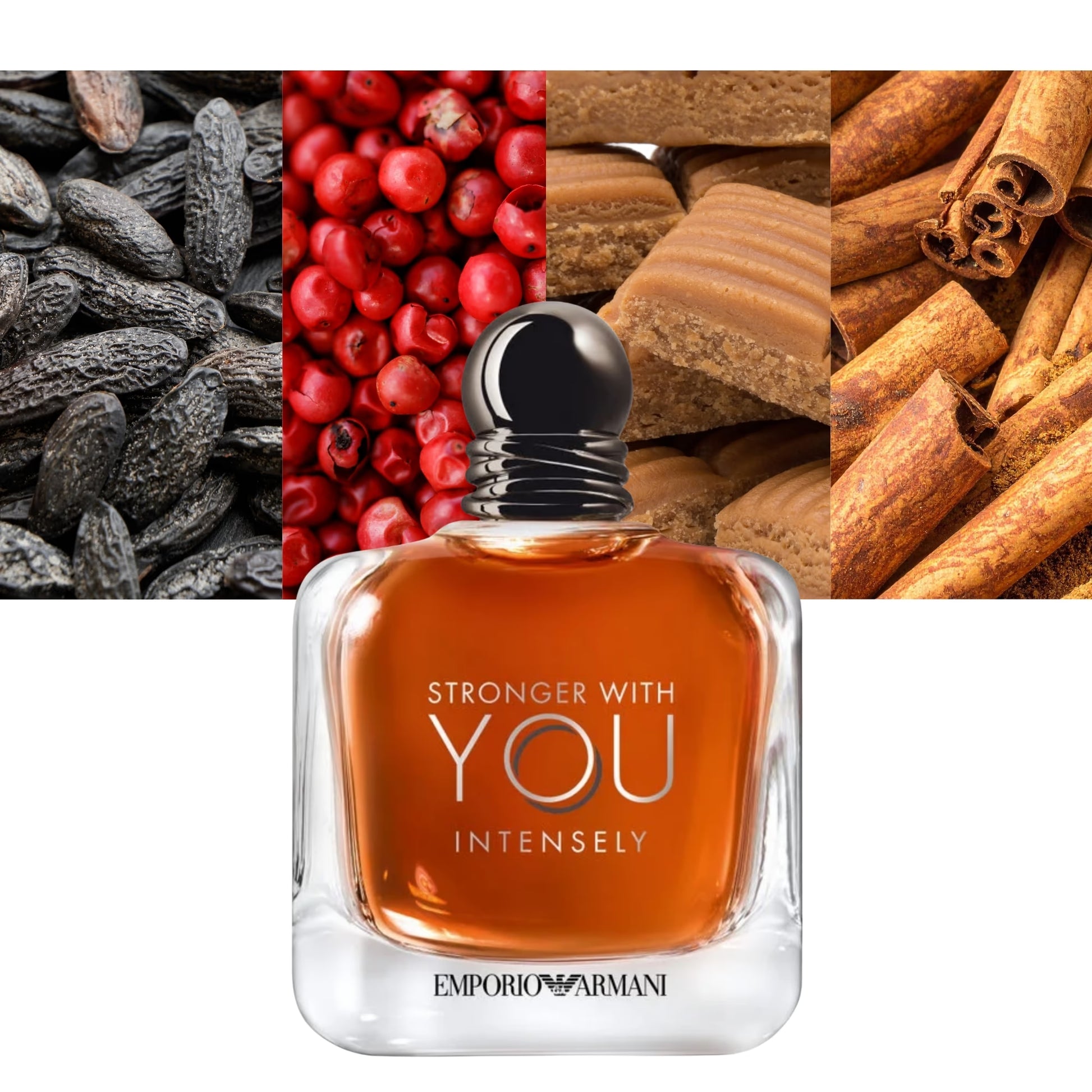 Stronger With You Intensely opens with a fresh kick of spices, juniper, and violet that awaken the senses. The heart reveals a rich blend of lavender, toffee caramel, and cinnamon — a sweet and spicy combo that adds warmth and depth. As the scent settles, it leaves behind a smooth trail of suede, vanilla, amber, and tonka bean, creating a bold and unforgettable finish.