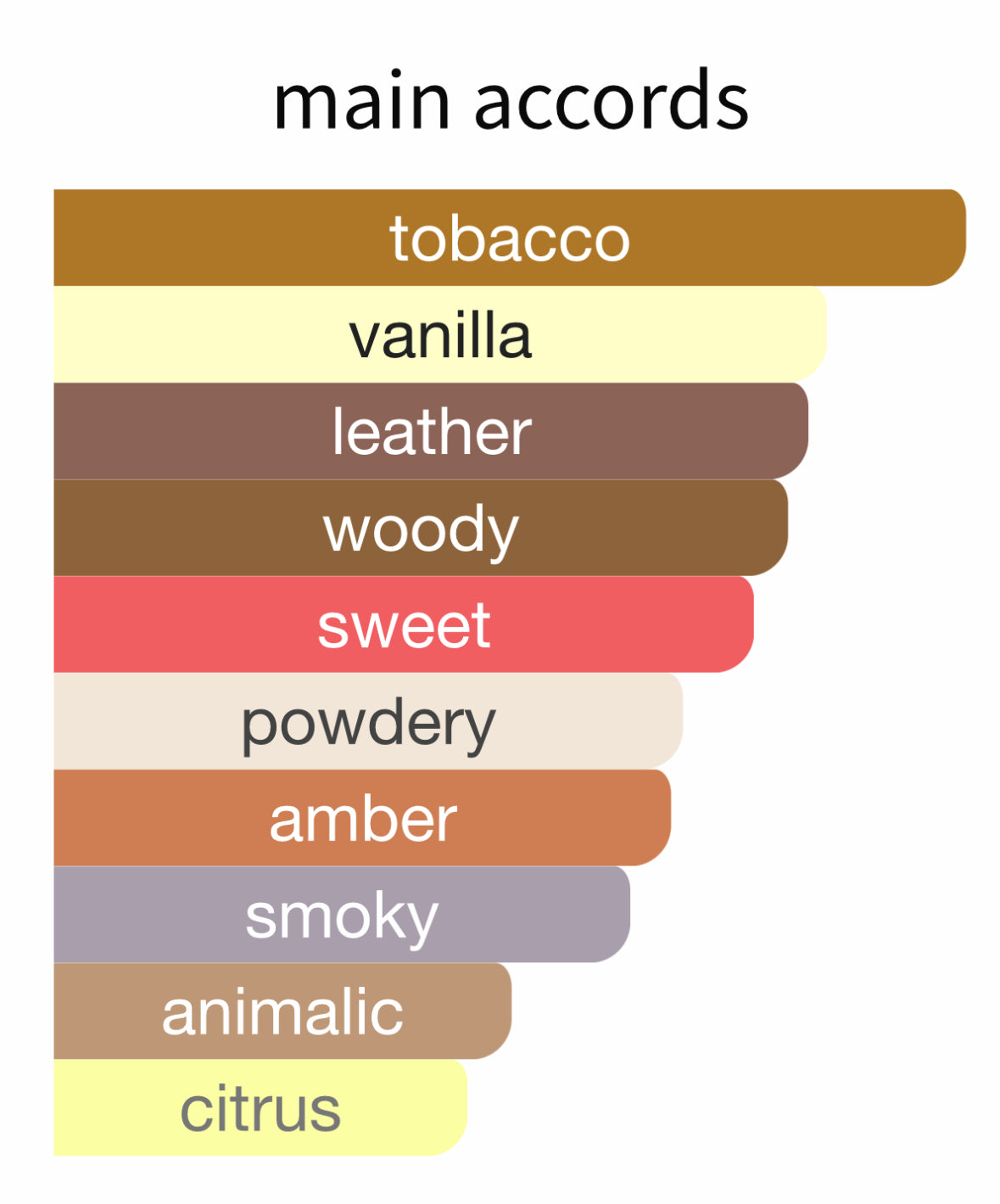 A mysterious and velvety fragrance. It opens with notes of bergamot and blond tobacco leaves. In the middle, the dark notes of birch and leather are embraced by a warm amber note. On the base, precious woods combine with the soft note of vanilla and musk.