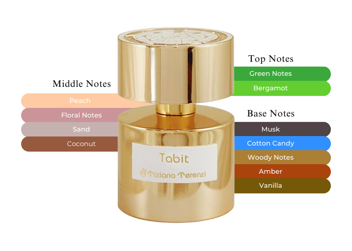 Tabit by Tiziana Terenzi begins with a delightful blend of ripe peach and aromatic bergamot, complemented by fresh green notes. As the fragrance develops, warmer heart notes emerge, creating a rich and unique harmony. This scent is further enhanced by unexpected notes of fruit, wood, and amber, with sweet gourmand undertones.