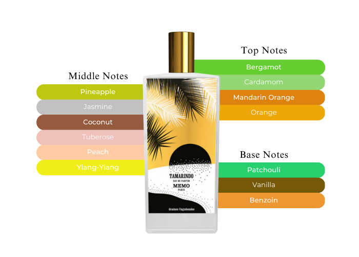 Memo Tamarindo's initial burst includes top notes of orange, mandarin orange, bergamot, and cardamom, offering a refreshing and invigorating start. As the scent evolves, it unveils a heart rich in fruity and floral elements, with peach, pineapple, ylang-ylang, and coconut, complemented by hints of jasmine and tuberose. Memo Tamarindo transports you to a lush wilderness, where majestic tamarind trees flourish amid turquoise waters and colorful parrots.