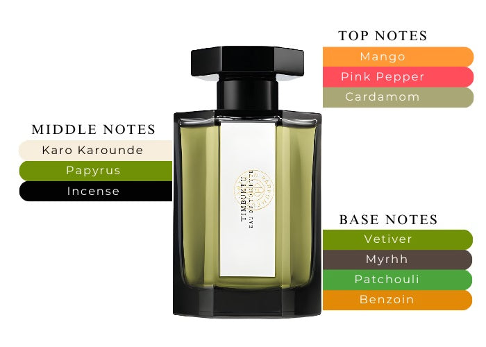 Timbuktu begins with a prominent green mango note that lends a fresh, slightly fruity character. This is beautifully balanced by the gentle warmth of cardamom and a touch of spicy pink pepper. As the scent evolves, it unveils a rich base of smoky florals, balms, woods, thick resins, and spices, featuring patchouli, myrrh, and vetiver. Crafted by master perfumer Bertrand Duchaufour, this fragrance evokes the essence of a perfumery ritual in Africa, merging ancient mysticism with modern artistry.
