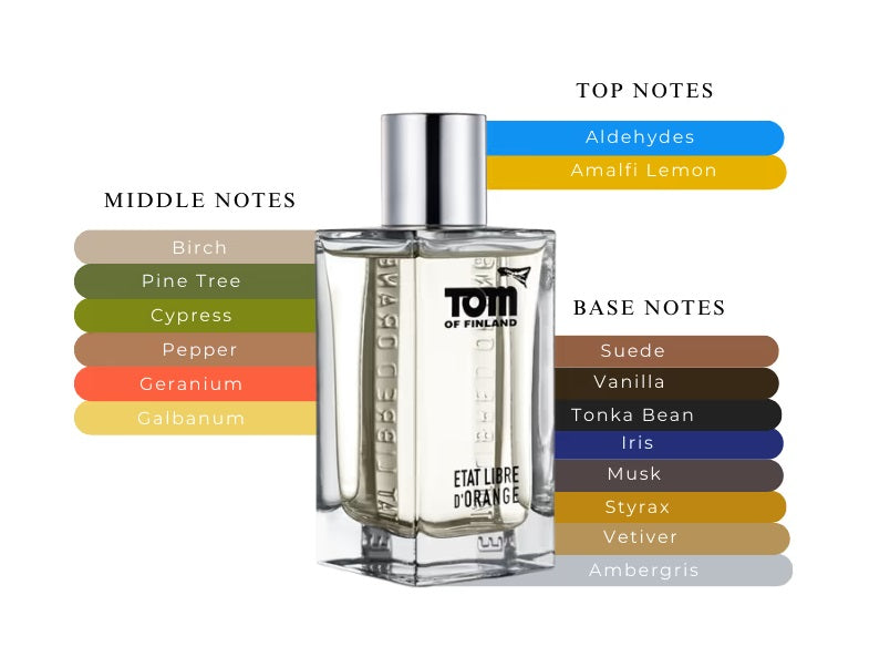 Tom of Finland opens with bright top notes of aldehyde and lemon, creating a lively introduction. Its heart features a lush blend of birch leaves, pine, safraleine, pepper, cypress, galbanum, and geranium, offering a green and vibrant core. Finally, the base reveals a warm and masculine finish through notes of vanilla, Tonka bean, iris, vetiver, pyrogenic styrax, suede, musk, and grey amber.