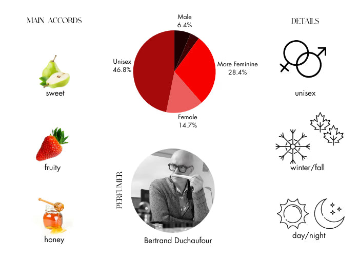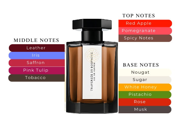 Traversee Du Bosphore top notes feature an alluring mix of red apple, pomegranate, and spicy hints, delivering a lively and refreshing opening. At its core, the fragrance unveils a sophisticated blend of leather, iris, saffron, pink tulip, and tobacco, adding richness and elegance. The base notes of nougat, sugar, and white honey infuse a delightful sweetness and warmth into the composition. Traversee Du Bosphore evokes a spirit of adventure and self-assurance, making it the perfect choice for the modern gentleman.