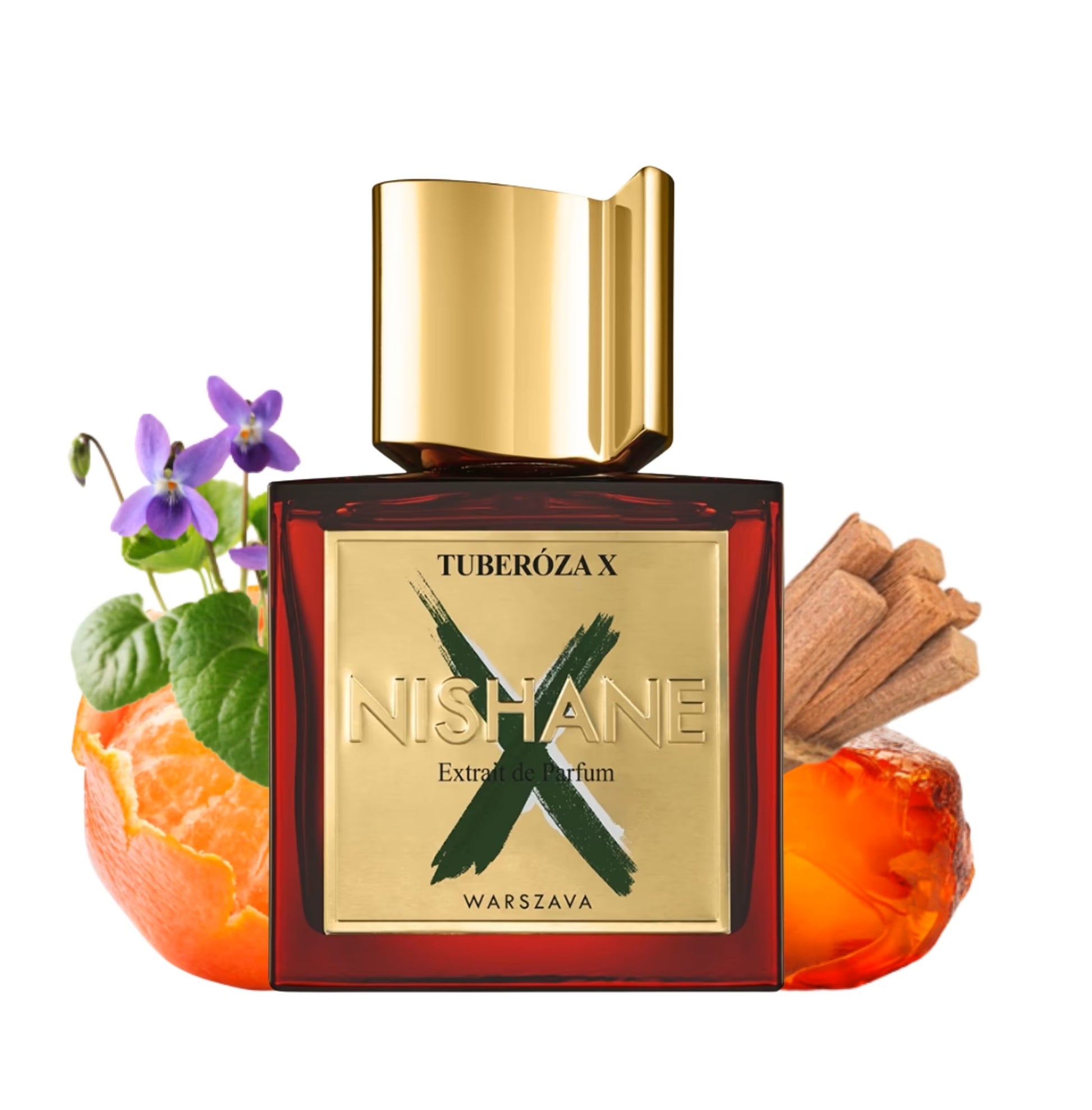 Nishane Tuberoza X opens with exotic ylang-ylang and juicy mandarin orange, leading into a heart of lush Indian tuberose, soft violet, and a hint of lipstick accord. The base is rich and sensual, blending velvety notes with musk, creamy sandalwood, and warm amber. Elegant and expressive, Tuberoza X offers a bold floral signature with a smooth, luxurious finish.