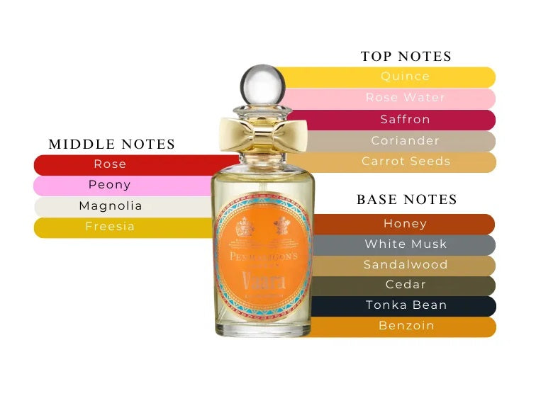 Vaara  opens with invigorating notes of quince, rose water, saffron, coriander, and carrot seeds. The heart unfolds with a floral bouquet of rose, peony, magnolia, and freesia, adding a soft and feminine essence. The base notes of honey, white musk, cedar, sandalwood, benzoin, and tonka bean provide warmth and depth to the scent. Vaara  is a versatile fragrance perfect for everyday use, radiating elegance and sophistication.