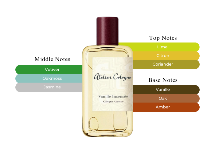 Atelier Cologne's Vanille Insensee the top notes feature a vibrant mix of lime, citron, and coriander, leading to a heart composed of vetiver, oak moss, and jasmine. The base notes present a warm combination of vanilla, oak, and amber. This distinctive fragrance draws its unique ingredients from around the world, including vanilla from Madagascar, lime from Mexico, and coriander from Russia.