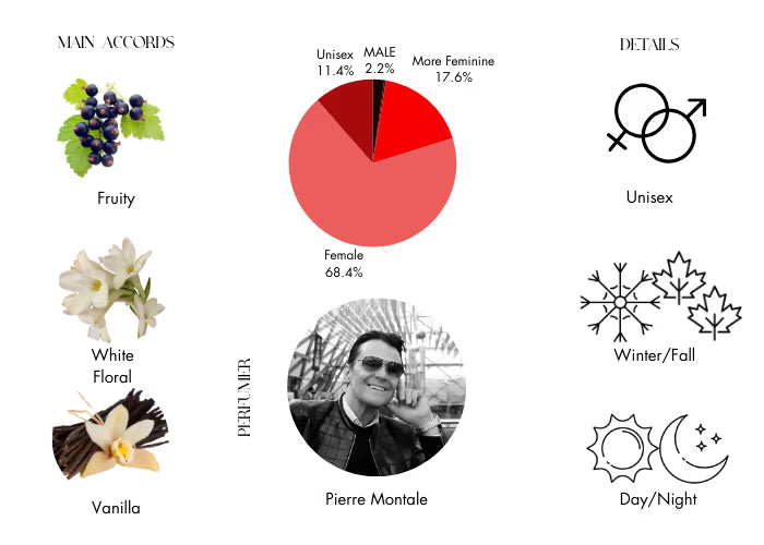 Velvet Vanilla  opens with mandarin, angelica, pear, clove, pink pepper, and blackcurrant. The heart notes are composed of a rich floral bouquet featuring rose, jasmine, neroli, and tuberose, embodying a unique blend of freshness and sensuality.