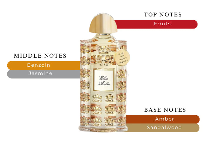 White Amber opens with a luminous fruity accord that adds a fresh and inviting touch. The heart of the fragrance blooms with delicate jasmine, intertwining beautifully with the sweet, resinous depth of benzoin. As the scent settles, a sensual base of golden amber and rich Indian sandalwood creates a lingering trail of refined allure.
