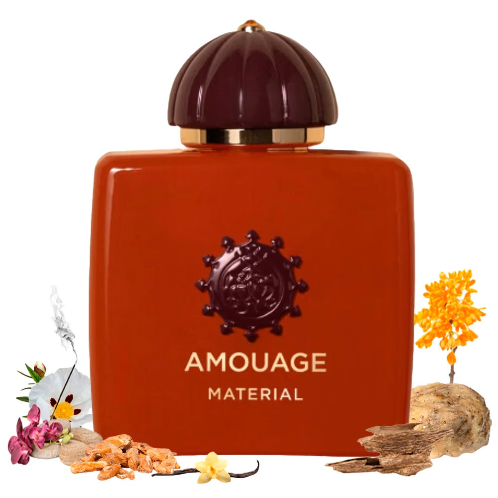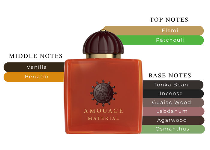 Amouage Material for Woman features a distinctive blend of notes designed for both women and men. The fragrance opens with warm and inviting top notes of elemi and patchouli, leading into heart notes of Madagascar vanilla and benzoin that impart a sweet and sensual quality. The base notes of tonka bean, incense, guaiac wood, labdanum, agarwood (oud), and osmanthus create a rich and opulent foundation.