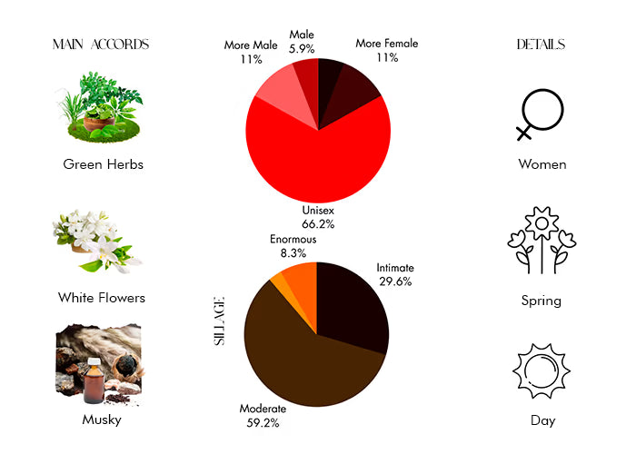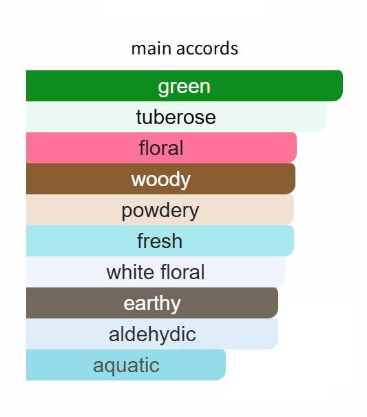 At the top, this fragrance opens with a refreshing blend of aldehydes and green leaves. These lead to the heart notes of water lily, iris, tuberose, and heliotrope, which combine to produce a floral bouquet that is at once feminine and luxurious. The scent then settles into the warm and earthy base notes of cashmere musk, patchouli, and vetiver, creating an alluring finish that lingers on the skin.