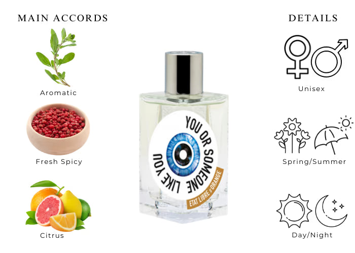 You Or Someone Like You is a citrus aromatic fragrance designed for both men and women, seamlessly combining top notes of mint, grapefruit, bergamot, and anise. The heart of the scent unveils green notes, cassis, rose, and hedione, culminating in a base of white musk. It captures the cool and fresh spirit of LA women, free from Hollywood's superficial influences. This contemporary creation is built on classic elements, embodying the boldness, authenticity, and freedom of expression that Etat Libre d'Orange celebrates in its scent compositions.